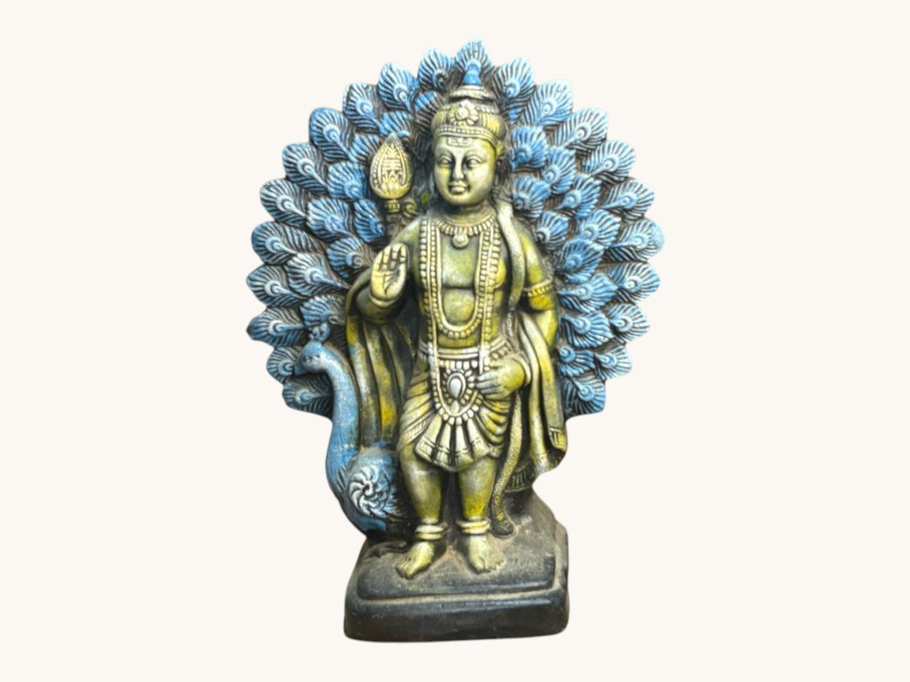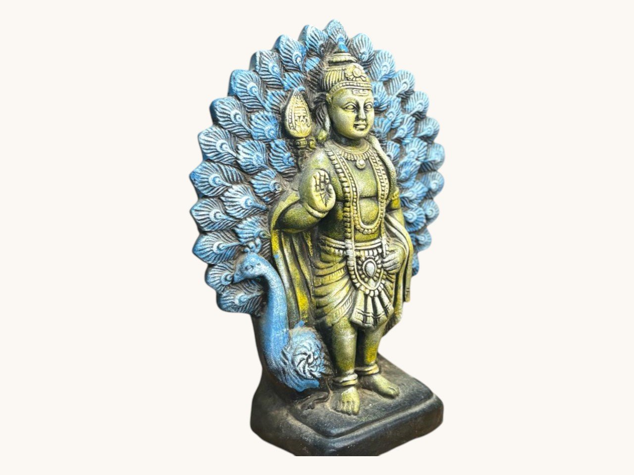 The statue features intricate detailing in the ornaments, attire, and facial expressions, highlighted with elegant shades of gold and blue. The peacock by his side and the decorative feather halo enhance the visual appeal, making it a stunning spiritual centerpiece.